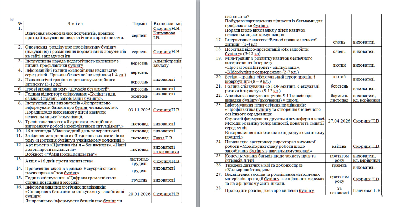 План заходів щодо протидії булінгу, запобігання випадкам насильства, та унеможливлення